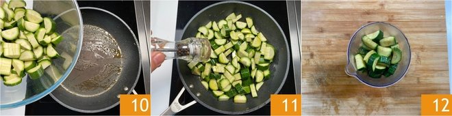 In the same pan where you cooked the shrimp, pour a drizzle of oil and add the zucchini 10. Season with salt and pepper 11. Cook over medium-high heat for 6-7 minutes, tossing them occasionally. Meanwhile, put a pot full of water on the stove, salted to taste, which will be used for cooking the pasta. When the zucchini are soft, transfer them to a tall, narrow container 12.