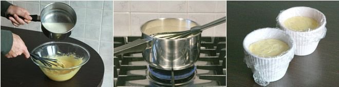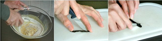 Boil the milk with the vanilla; when the milk reaches a boil, turn off the heat and let it cool. Open the vanilla pod and extract the seeds; mix them with the milk, which you will gradually add to the egg, sugar, and flour cream, stirring continuously.