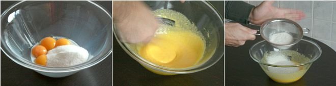 Combine the egg yolks and sugar in a bowl. Mix well until you obtain a fluffy and frothy cream, then sift the flour and add it to the cream, mixing well to avoid the formation of lumps.
