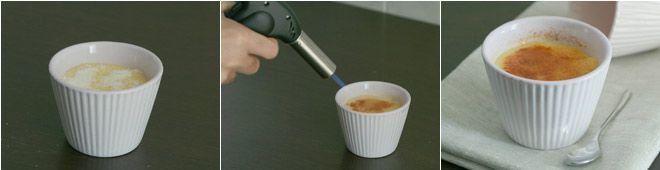 Let it rest in the fridge until serving time, then remove the plastic wrap, sprinkle the surface with sugar, and caramelize it with a gas torch until the sugar becomes golden and crunchy.