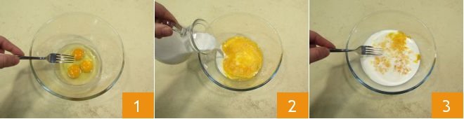 To prepare the crepes, start by cracking the eggs into a high-sided bowl 1, mix with a fork, and add the milk 2. Stir thoroughly to blend these two ingredients 3.