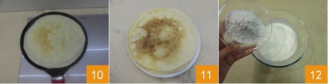 Cook the other side for about 1 minute, waiting for it to color 10. Once cooked, transfer it to a serving plate or a cutting board. Repeat this operation until the batter is finished; you should obtain 17 crepes with a diameter of about 6 inches: stack the crepes so they remain soft 11. Let them cool, and in the meantime, prepare the filling. Pour the cream and powdered sugar into a bowl 12.