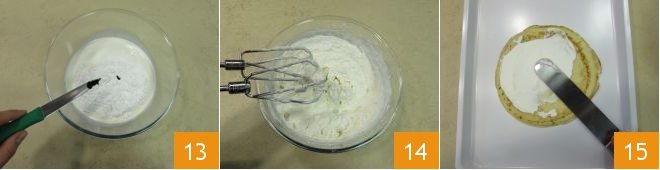 and the seeds from half a vanilla pod 13. Whip everything with an electric mixer 14. Then take a 6-inch metal ring and place it on a tray where you have laid a sheet of parchment paper. Take a crepe and spread a thin layer of Chantilly cream on it 15.