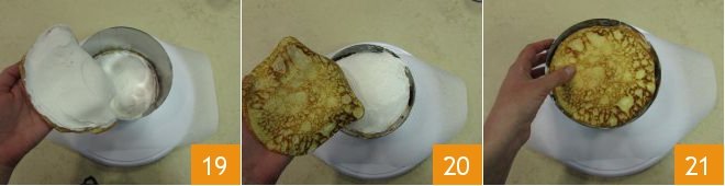 Then place it inside the ring, making sure that the cream faces you (16-17). Take the second crepe, cover it with cream 18.
