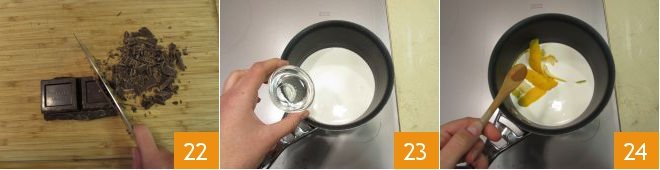 Before removing the cake from the fridge, prepare the ganache. Chop the dark chocolate 22 and transfer it to a bowl. Place the cream, glucose 23, orange zest, and cinnamon 24 in a saucepan.