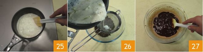 Bring everything to a boil over low heat 25, then immediately pour the cream into the chocolate, filtering it with a sieve 26. Mix with a spatula until you obtain a smooth ganache 27.