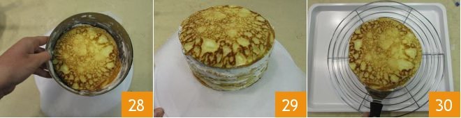 Take the crepe cake out of the fridge, remove the ring (28-29), and transfer it to a wire rack 30.