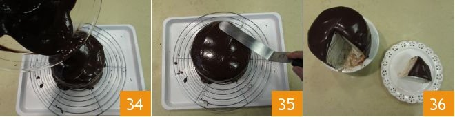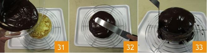 Pour half of the ganache over the cake 31 and use a spatula to spread it over the surface 32 and the sides 33. Refrigerate for 10 minutes.