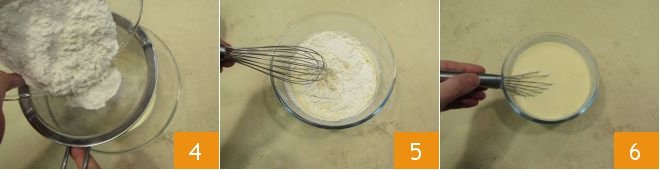 Place a sieve over the bowl and then sift the flour into it 4. For convenience, you can add it in two batches and mix to avoid lumps. Then, use a whisk to vigorously mix the flour until it is absorbed 5. Continue stirring until you obtain a smooth, velvety mixture without lumps 6.