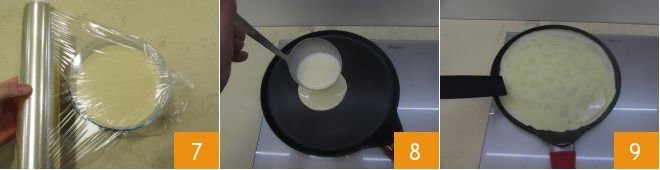 At this point, cover the bowl with transparent plastic wrap and let it rest for at least 30 minutes in the refrigerator 7. After the time has passed, stir the batter to revive it, then heat a 6-inch crepe pan and grease it with a pat of butter. Once at temperature, pour a ladle of batter sufficient to cover the surface of the pan 8. You can use a crepe spreader or rotate the pan to distribute the batter evenly; it is advisable to perform these operations quickly as the batter will cook rapidly. After about 1 minute over medium-low heat, you should notice a slight golden color; the edges will begin to lift, so you can flip the first crepe with a spatula 9.
