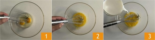To prepare crepes without butter, pour the whole eggs into a bowl 1 and beat them with a whisk 2. Gradually pour in the milk 3.