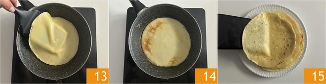After about a minute, keeping the flame medium, you will notice that the edges will begin to detach from the pan and will be slightly golden, flip the crepe with a spatula 13 and cook it on the other side 14. Transfer the crepe to a plate, stacking them one on top of the other (15). The crepes without butter are ready, and you can choose to serve them sweet or savory.