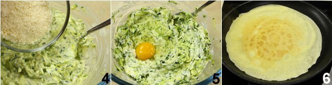 Add the Emmental cheese and half of the Grana Padano 4, and finally the egg 5; then mix and adjust with salt and pepper. Prepare 6 crepes using the ingredients listed above and following the procedure you can find Sweet and savory crepes (Basic recipe) 6.