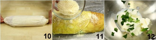 Close the roll like a candy, twisting the ends of the paper 10, and bake it in the oven at 356°F for about 30 minutes. Then open the paper, sprinkle the roll with the remaining Grana Padano 11 and some knobs of butter, and broil for another 5 minutes. Meanwhile, prepare the basil cream in this way: place 2 tablespoons of Philadelphia with a few basil leaves 12, two tablespoons of milk, Grana Padano, and a pinch of freshly ground pepper in a small saucepan over a bain-marie, remove from the heat as soon as the sauce is warm. Serve the zucchini crepe roll in slices, drizzling with basil cream!