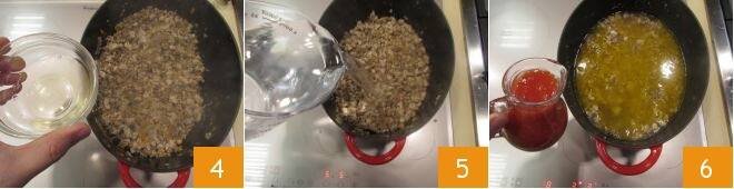 Sweat with white wine 4, let it evaporate, then pour in the water 5 and the tomato puree 6. Stir and continue cooking for about 3 hours or until the sauce has thickened.