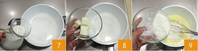 In the meantime, prepare the béchamel sauce: heat the milk in a saucepan 7; separately, melt the butter over low heat 8, then turn off the heat and add the cup (100 g) of flour all at once 9,