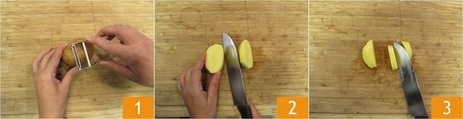 To prepare the crispy cheese potatoes, first peel the potatoes 1, then cut them in half 2 and then into wedges 3.