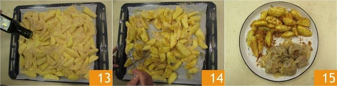 Transfer the potatoes to a baking tray lined with parchment paper. Add a drizzle of oil 13, mix, and bake in a preheated static oven at 400°F on the middle rack for 40 minutes. When they are well browned, remove them from the oven and serve your potatoes 15.