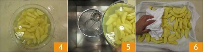 Place them in a bowl, cover them with water 4, and let them rest for 30 minutes. This will remove the starch. Now drain them 5, transfer them to a tray, and pat them dry with paper towels 6.