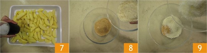 Season them with salt 7. Now in another bowl, prepare the breading: pour in the breadcrumbs, grated pecorino 8, and grated parmesan 9.