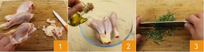 To prepare the crispy chicken thighs, start by removing the fattier parts 1, place the thighs in a bowl and coat them with olive oil 2 to help the breading stick better. Now focus on the breading: chop the rosemary and thyme 3