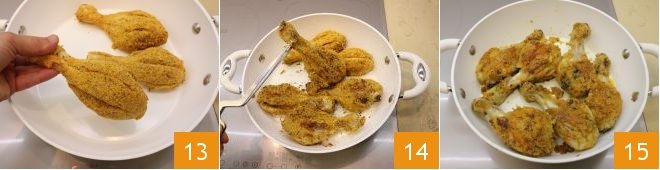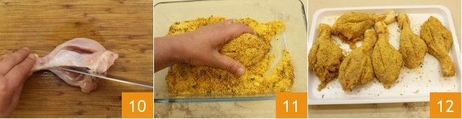 Take the chicken thighs and make lengthwise cuts 10 to better absorb the flavors. Coat the thighs in the breading, making sure it sticks on all sides 11, then place the thighs on a tray 12.