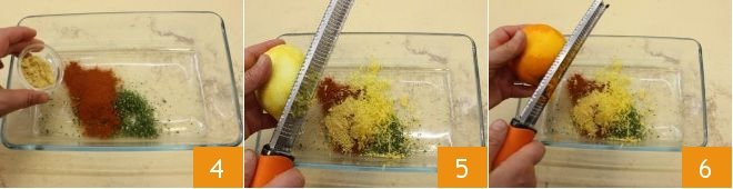 and place the chopped herbs in a wide bowl, add the sweet paprika, yellow mustard powder 4, lemon zest 5, and orange zest 6.