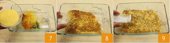 Add the yellow cornmeal 7, garlic powder 8, salt 9, pepper, and mix to blend the breading.