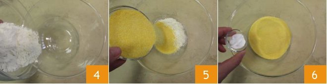 In a bowl, pour the all-purpose flour 4 and cornmeal 5, and add the baking soda 6.