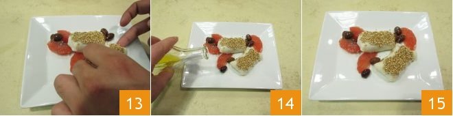 and then place the fillets 13. Garnish with a splash of raw oil to your pleasure 14 here is your crispy hake with grapefruit salad: enjoy your meal 15!