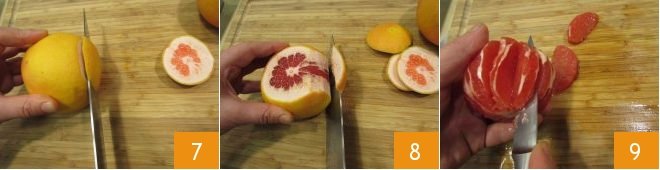 While the hake fillets are baking in the oven, focus on the grapefruit salad. To start, you will need to peel the grapefruit raw. So cut the caps 7, then the rest of the peel being careful to also remove the white part 8. With a sharp knife with a smooth blade, extract the pulp into segments, following the veins of the skin 9