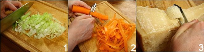Wash and dry the iceberg lettuce leaves, finely chop them 1, and place them in a large salad bowl. With the help of a peeler, peel and cut the carrots into ribbons 2; again with the peeler, create curls from a whole piece of Parmigiano Reggiano 3 (or Grana Padano).