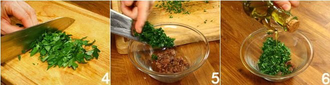 Finely chop the parsley 4 and the anchovy fillets and place them in a bowl 5 with some oil 6 (and vinegar if you like), salt, and ground pepper; mix the ingredients with a fork and let them rest for a few minutes.