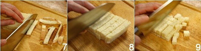 Take the slices of sandwich bread, remove the darker crusts 7, and cut them into 1/2 inch cubes (8-9).