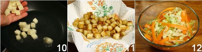 Place two tablespoons of extra virgin olive oil in a pan, heat it, and then toss in the bread cubes over medium heat 10, turning them on all sides to brown them fully. Once browned, place them on kitchen paper towels to drain excess oil 11. Add the carrots to the iceberg lettuce 12,