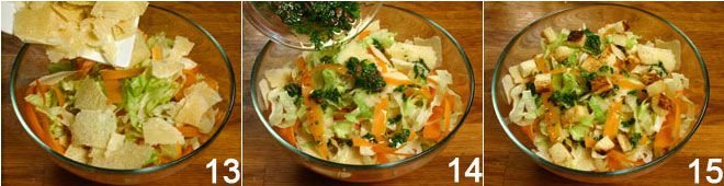 the parmesan curls 13, and the parsley and oil dressing 14: gently mix the ingredients, divide the salad into serving plates, and then add the crispy croutons 15. Serve immediately.