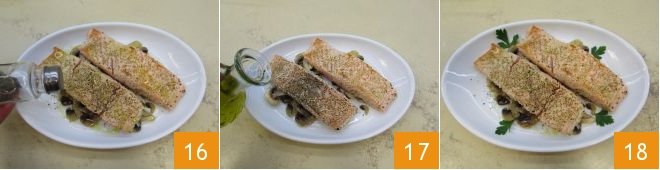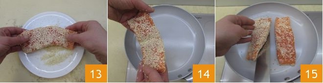 then, on a plate, place some white sesame seeds and a bit of salt and bread the fillets by covering them well 13, then heat a non-stick pan well and place them to cook 14 for about 2 minutes per side, being careful to turn them occasionally 15 so they cook evenly.