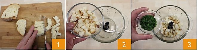 To prepare crispy salmon on flatbreads, first take care of the bread by cutting the slices into small cubes 1. Put the reduced bread in a blender 2, then add the chopped parsley 3