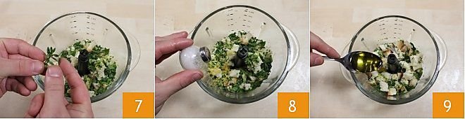 and marjoram leaves 7 to the blender. Then adjust with salt and pepper 8 and also add the two tablespoons of extra virgin olive oil 9.