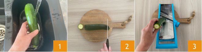 To prepare the crispy zucchini chips, start by washing 1 and drying the zucchinis, then trim them 2, and with the help of a mandolin (for a more precise result) or a knife, slice them thinly to get 1/8 inch rounds 3.