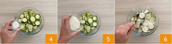 Place them in a bowl, add the salt 4 and the flour 5, then mix 6.