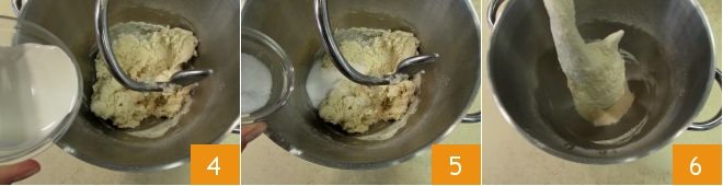 Then stop the mixer, pour in the cream 4, salt, and sugar 5. Start the mixer again at initially low and then medium speed, working everything for about 8 minutes, until the edges of the mixing bowl are clean and the dough has come together. At the end, the dough will be soft, elastic, and silky 6.