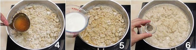 mix well and start adding the broth 4 and milk 5, one ladle at a time, stirring constantly for 10 minutes: the mixture will be ready when it easily detaches from the surface of the pan. Salt and pepper to taste 6,