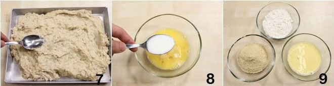 then transfer the mixture to a wide, flat tray where you will let it cool 7. Now move on to the breading: in a bowl, beat an egg together with three tablespoons of milk 8, then prepare a generous plate of flour and a plate with breadcrumbs 9.