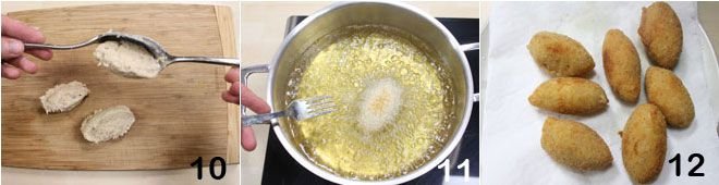 Once the croquetas mixture is cold, form quenelles about 2 inches long, using two spoons dipped in oil to prevent the mixture from sticking 10. Now roll the croquetas first in the flour, then in the egg, and finally in the breadcrumbs and fry them in plenty of hot oil 11. Once ready, drain the croquetas on a plate with paper towels to absorb the excess oil 12. The tapas croquetas are ready, serve them on a serving plate while still hot.