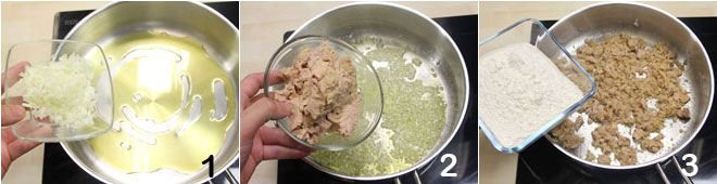 To make the croquetas, start by preparing the mixture: peel and finely chop half an onion, then sauté it over low heat with three tablespoons of oil until it is completely wilted, this may take about 15 minutes 1. If the onion becomes too dry, add a little hot water to prevent it from burning. Add the drained tuna, stir gently, and cook until well browned 2. At this point, add the flour 3,