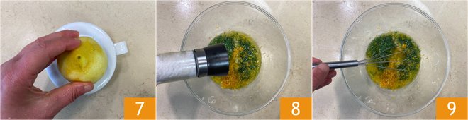Add the juice of one lemon 7, season with salt and pepper 8, and mix 9.