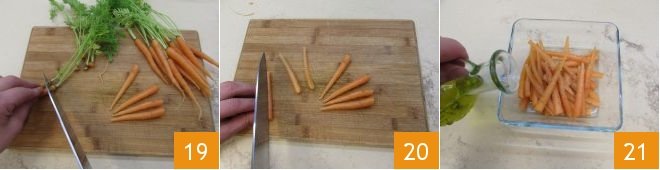 Now, take care of the baby carrots: remove the tops with a knife 19, wash them, cut them in half 20, and season with salt, oil 21, pepper, and thyme.