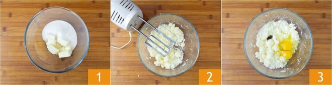 To prepare the ricotta and jam crumble, first let the ricotta drain in a fine mesh strainer for 30 minutes. In the meantime, start preparing the base. In a bowl, pour the sugar, add the butter 1 and work with a hand mixer for a few minutes until you get a floury mixture 2. Then add the eggs and vanilla extract 3.