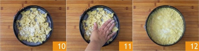 Line a 9-inch springform pan with parchment paper, distribute half of the dough inside 10 and compact it with your hands 11 until it completely covers the base of the pan 12.
